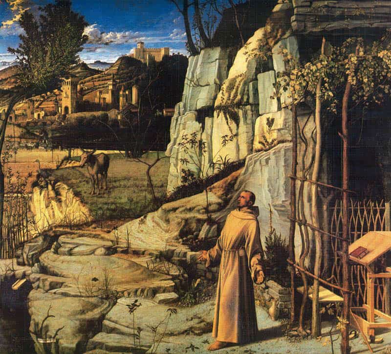 Il pittore fa cioè parlare Dio attraverso il mondo e l’ambiente più che attraverso le opere, e le parole del santo, e pure le stimmate, vengono impresse nelle mani da una luce naturale, non da un Serafino. Giambellino si appella del resto al creato in un momento delicato per la storia di Venezia in cui il pericolo saraceno si è fatto più stringente e vicino. Pochi anni prima, nel 1453, l’impero d’Oriente era caduto e da allora la città più esposta agli scombussolamenti provenienti da est era la Serenissima. La repubblica, infatti, viene costretta a cambiare politica, voltando le spalle all’Adriatico e così, per la prima volta nella propria storia, onde mantenere alto il prestigio, s’interessa alle città dell’entroterra. Un momento delicato: di transizione e anche di smarrimento.