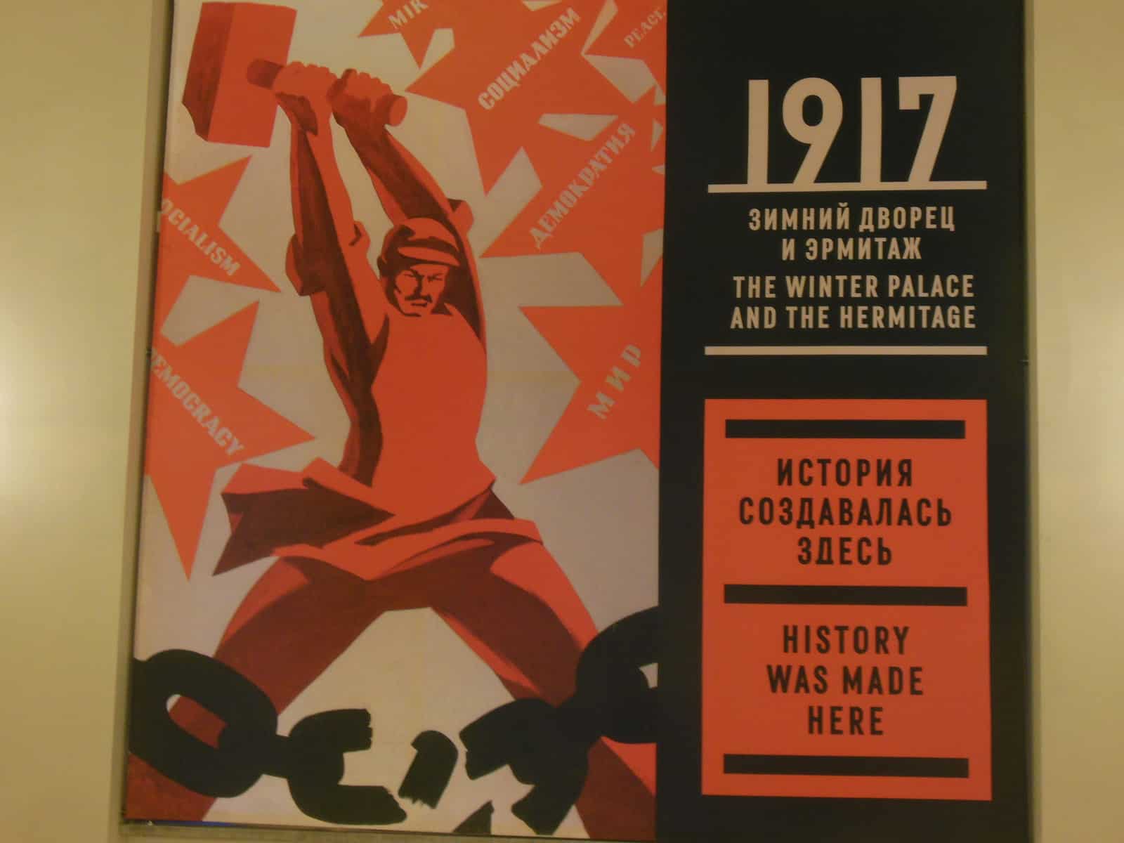 Molto interessante, nella mostra, è l’accostamento tra la Rivoluzione bolscevica russa e la Rivoluzione Francese (1789-1799). L’esposizione ne evidenzia le analogie ricordandone: per esempio il significato puramente simbolico di eventi ritenuti cruciali e invece puramente propagandistico quali la Presa della Bastiglia, il 14 luglio 1789, a Parigi e quella del Palazzo d’Inverno, la notte tra il 7 e l’8 novembre 1917, a Mosca. Da tempo, infatti, la Bastiglia non era più una prigione per prigionieri politici, tanto quanto appunto l’Ermitage non era più una residenza imperiale, e l’assalto al Palazzo d’Inverno rappresentato con toni epici nel celebre film Ottobre del regista Sergej M. Ėjzenštejn (1898–1948) non è mai avvenuto: un esempio eclatante di disinformazione pura che però ha plasmato l’immaginario di generazioni intere. In realtà, le persone uscite dal teatro Mariinskj che nella notte fatidica passeggiavano tranquillamente nella piazza antistante l’Ermitage non si resero nemmeno conto di quanto stava accadendo. Dopo il colpo di cannone “a salve” sparato dall’incrociatore Aurora, i bolscevichi s’introdussero nel palazzo da un ingresso secondario per arrestare Kerenskij e gli altri membri del governo provvisorio, e socialista non più oramai zarista. I prigionieri furono poi condotti nella fortezza dei Santi Pietro e Paolo per essere rilasciati quasi subito.