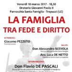 LA FAMIGLIA TRA FEDE E DIRITTO Introduce: Giacomo Pezzuto Saluti: Don Alessandro Scevola, Avv, Luca De Netto Intervengono: Don Flavio De Pascali e il Dott. Alfredo Mantovano Presso l'Oratorio Giovanni Paolo II - Parrocchia Santa Famiglia - Trepuzzi (LE) … [Leggi di più...] infoLa famiglia tra fede e diritto