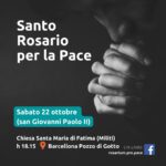 Sabato 22 ottobre, ore 18:15 - Promosso da Alleanza Cattolica, in collaborazione con la parrocchia Santa Maria di Fatima, presso la chiesa Santa Maria di Fatima (Militi), sarà recitato un Santo Rosario per la pace. … [Leggi di più...] infoBarcellona Pozzo di Gotto (ME), Santo Rosario per la pace