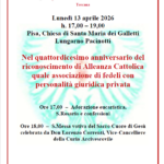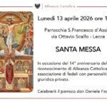 Lunedì 13 aprile 2026 ore 19.00 Parrocchia S.Francesco d'Assisi via Ottavio Scalfo Lecce SANTA MESSA In occasione del 14° anniversario del riconoscimento di Alleanza Cattolica come associazione di fedeli con personalità giuridica privata. Celebrerà il parroco don Daniele Fazzi … [Leggi di più...] infoLecce – SANTA MESSA