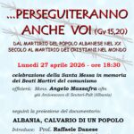 ...PERSEGUITERANNO ANCHE VOI (Gv 15,20) DAL MARTIRIO DEL POPOLO ALBANESE NEL XX SECOLO AL MARTIRIO DEI CRISTIANI NEL MONDO Lunedì 27 aprile 2026 - ore 18:30 celebrazione della Santa Messa in memoria dei Beati Martiri del comunismo officierà: Mons. Angelo Massafra ofm già Arcivescovo di Scutari-Pult (Albania) seguirà la proiezione del documentario: ALBANIA, … [Leggi di più...] infoBrindisi – …PERSEGUITERANNO ANCHE VOI (Gv 15,20)