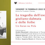 Venerdì 18 febbraio 2022 ore 18.30 La tragedia dell’esodo giuliano-dalmata e delle foibe Un focus su Pola Intervengono: Guido Giacometti, referente per la Toscana della Associazione Nazionale Venezia-Giulia e Dalmazia Roberto Spazzali, autore del volume: Pola città perduta. L’agonia, l’esodo (1943 – 1947) (Ed. Ares – IRCI) Modera: Susanna Manzin di Alleanza … [Leggi di più...] infoLa tragedia dell’esodo giuliano-dalmata e delle foibe