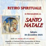 Ritiro spirituale in preparazione al Santo Natale sabato 20 dicembre dalle ore 16.00 alle ore 20.00. Cappella Suore d'Ivrea via Martiri d'Otranto - Lecce. Predicatore Mons. Mauro Carlino, parroco della Basilica di S.Croce in Lecce. … [Leggi di più...] infoLecce -Ritiro in preparazione al Santo Natale