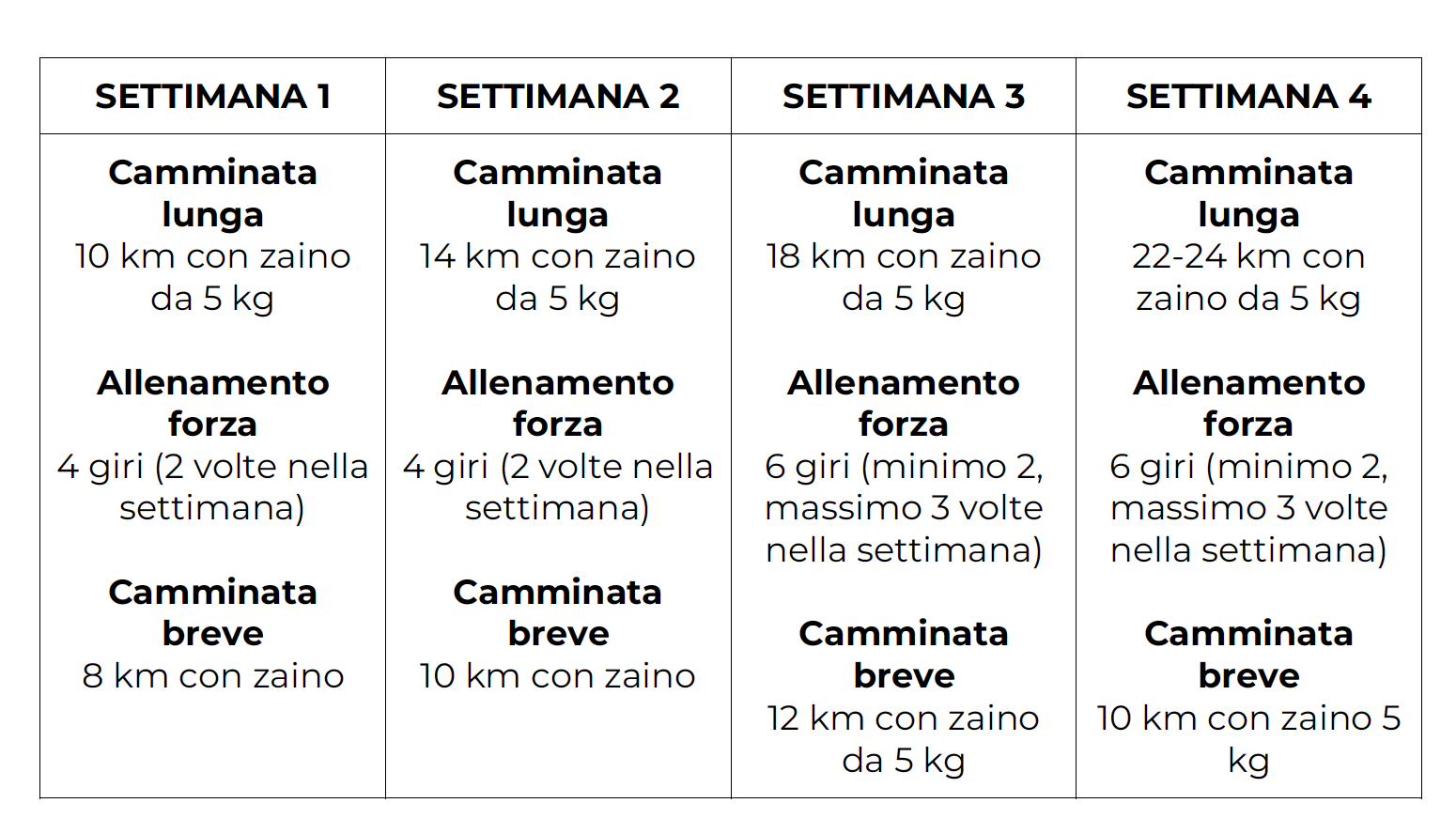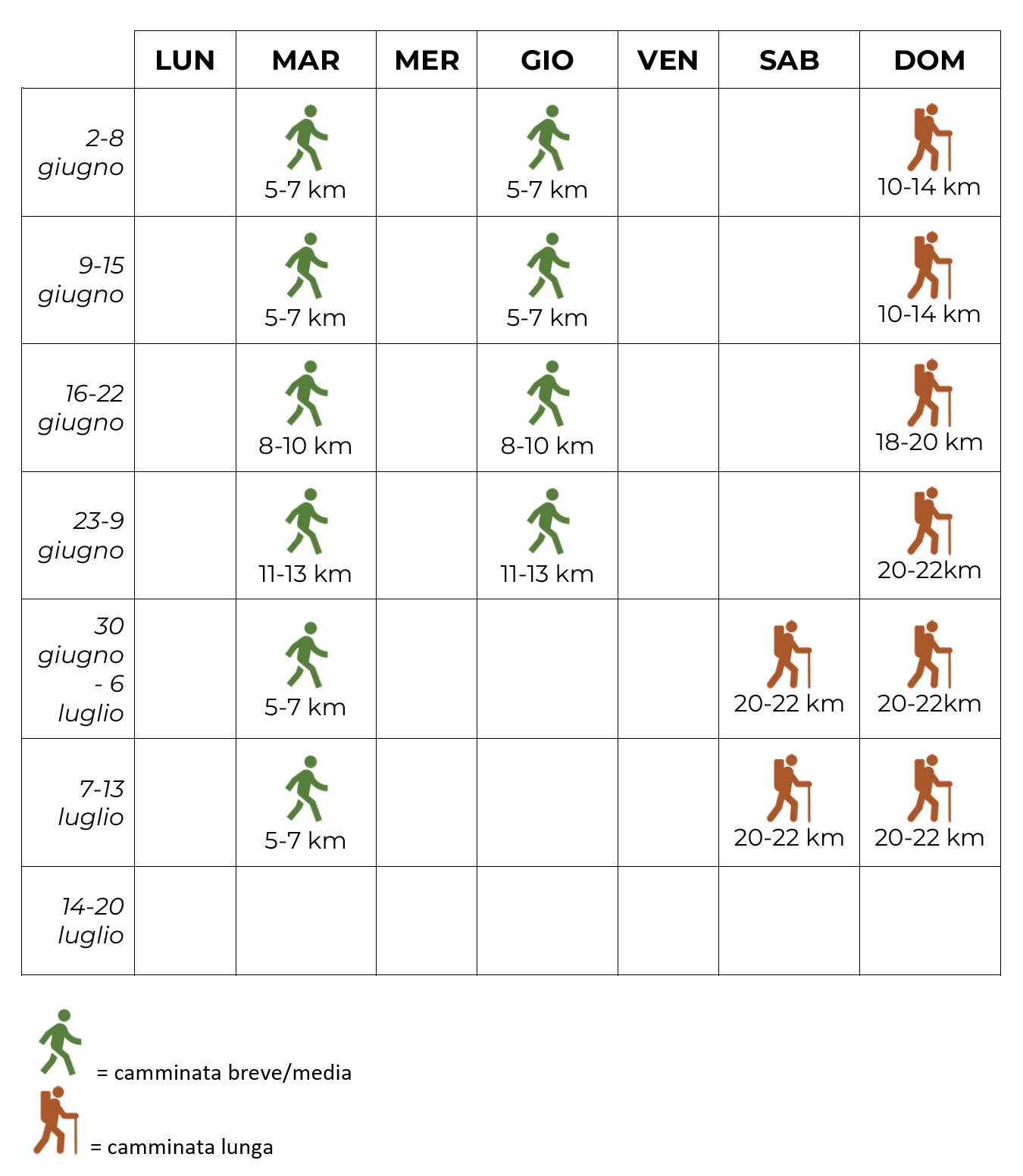 - Nella terzultima e penultima settimana sono stati messi due lunghi vicini per abituarsi a camminare per piรน giorni (quindi se dovete spostare i giorni di allenamento cercate comunque di tenerli vicini).