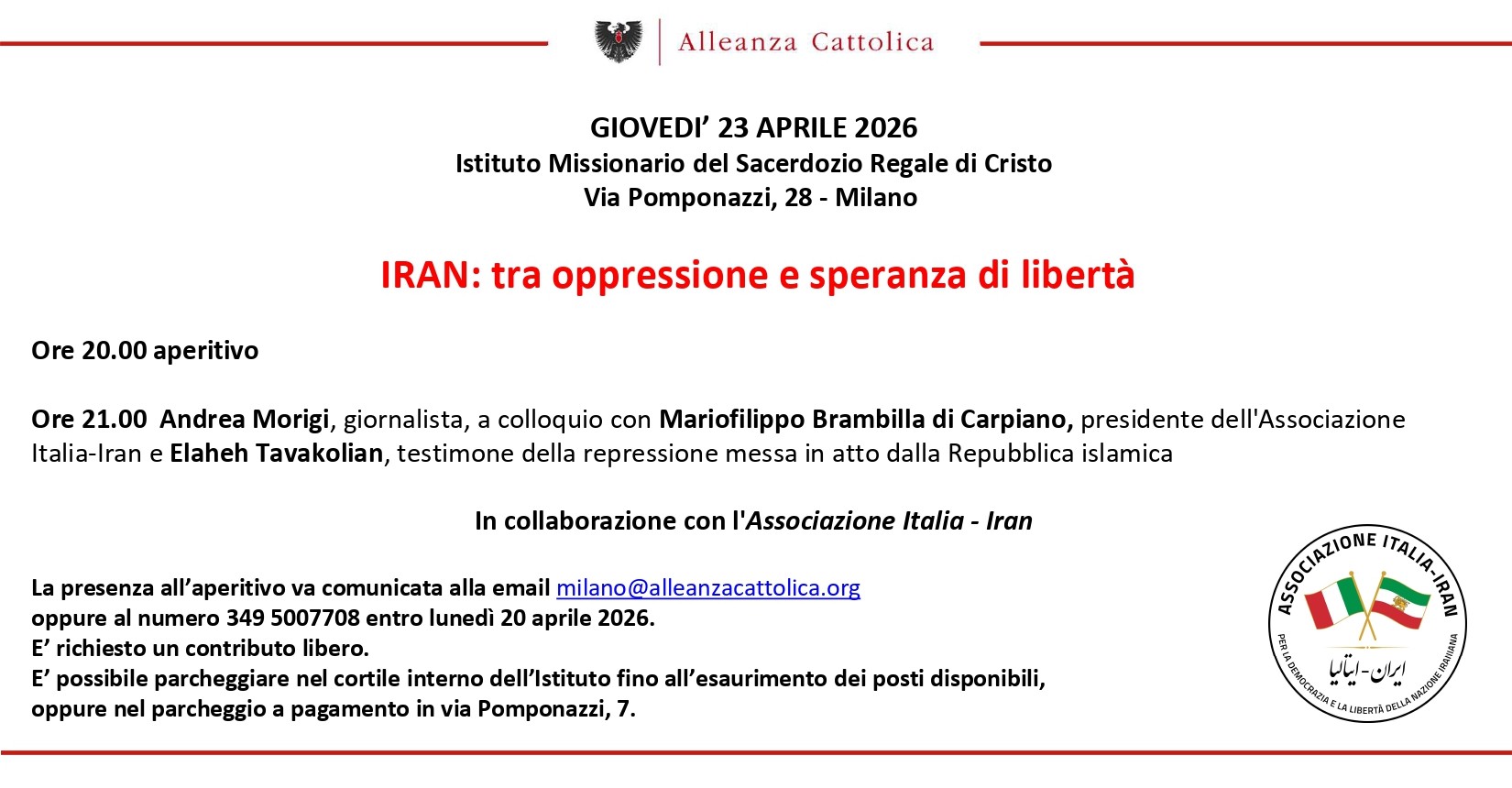 Iran: tra oppressione e speranza di libertà 23 Aprile - 20:00 fino a 23:00 Istituto Missionario del Sacerdozio Regale di Cristo Via Pomponazzi, 28, Milano, Lombardia, Italy