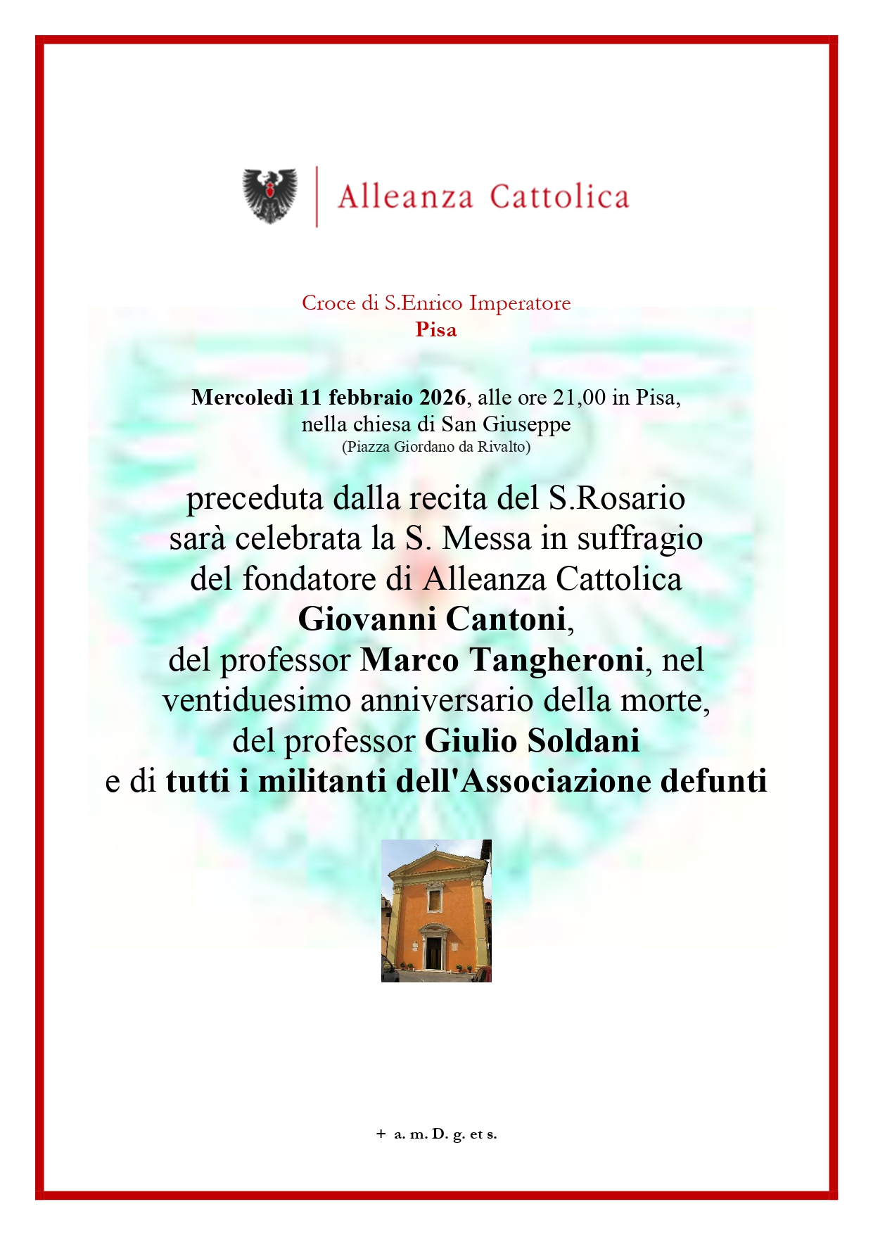 Pisa, 11 febbraio 2025, ore 21, presso la Chiesa di San Giuseppe in Piazza Giordano da Rivalto, preceduta dalla recita del S. Rosario, sarà celebrata la S. Messa in suffragio di Giovanni Cantoni fondatore di Alleanza Cattolica, del Prof Marco Tangheroni, nel ventiduesimo anniversario della morte, del Prof. Giulio Soldani e di tutti i militanti […]