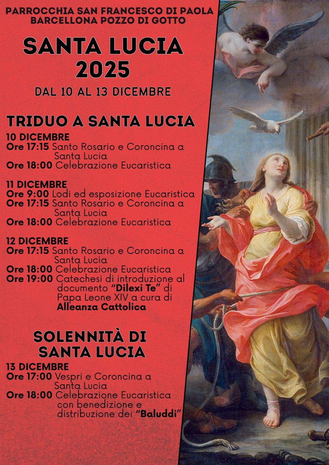 Organizzato dalla parrocchia di San Francesco di Paola presso i propri locali, nell'ambito del triduo in preparazione alla solennità di Santa Lucia, venerdì 12 dicembre 2025, alle ore 19:00, Luca Bucca, di Alleanza Cattolica, terrà un intervento sul tema "Introduzione alla lettura dell'esortazione apostolica Dilexi te".