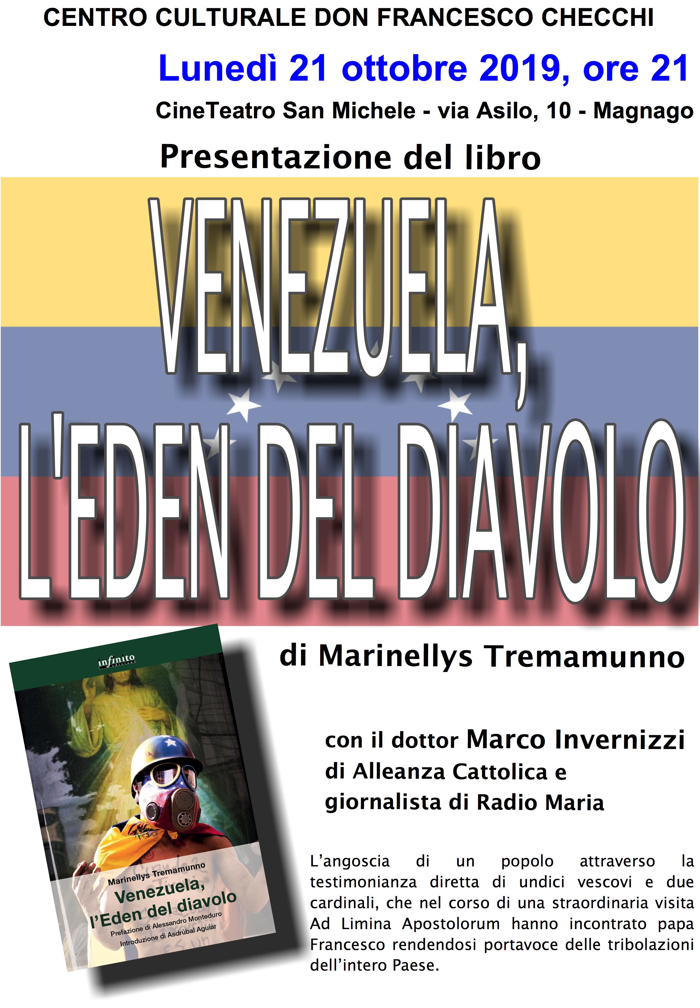 21 Ottobre 2019. ore 21, Magnago (MI), presso il CineTeatro San Michele, in Via Asilo 10, su iniziativa del Centro Culturale Don Francesco Checchi, si terrà la presentazione del libro della giornalista venezuelana Marinellys Tremamunno “Venezuela, l’Eden del diavolo”. Interverrà il dott. Marco Invernizzi, Responsabile Nazionale di Alleanza Cattolica e giornalista di Radio Maria.