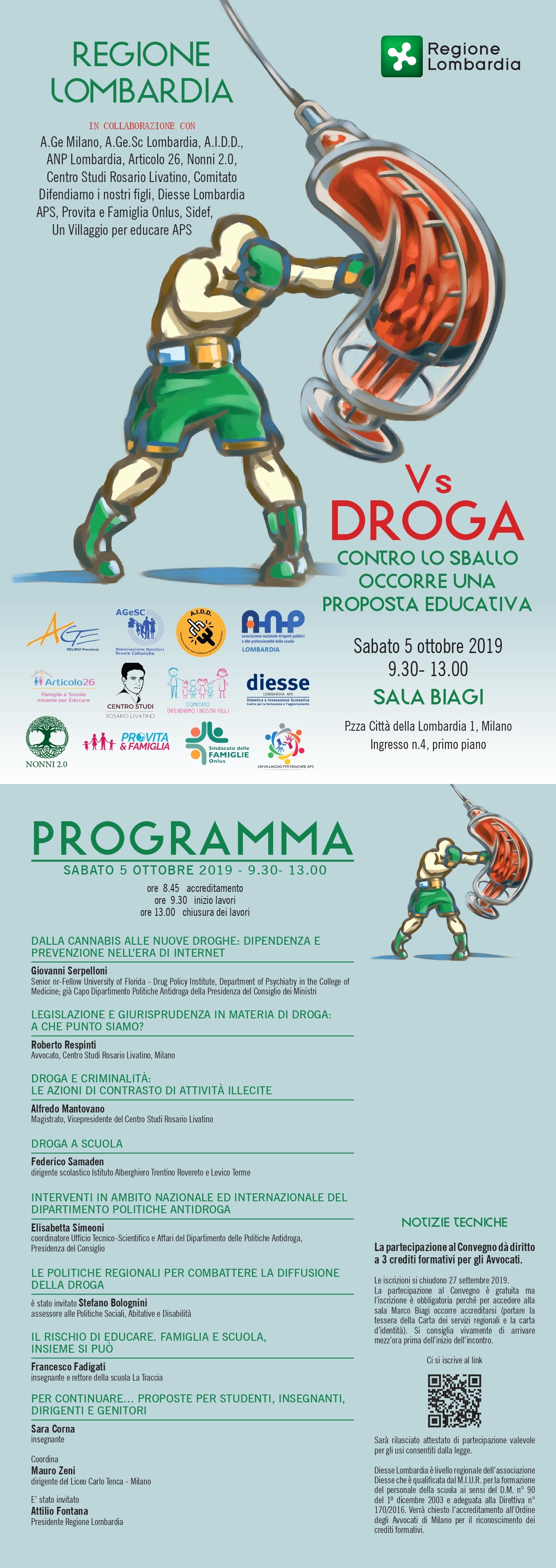 5 Ottobre 2019, ore 9.30, Milano, presso Sala Biagi, in Piazza Città della Lombardia, ingresso n.4 primo piano, su iniziativa della Regione Lombardia, in collaborazione con A.Ge Milano, A.Ge.Sc Lombardia, A.I.D.D., ANP Lombardia, Articolo 26, Nonni 2.0, Centro Studi “Rosario Livatino”, Comitato Difendiamo i Nostri Figli, Diesse Lombardia, APS, Provita e Famiglia Onlus, Sidef, Un Villaggio per educare APS, si terrà il convegno: “Vs droga – Contro lo sballo occorre una proposta educativa”