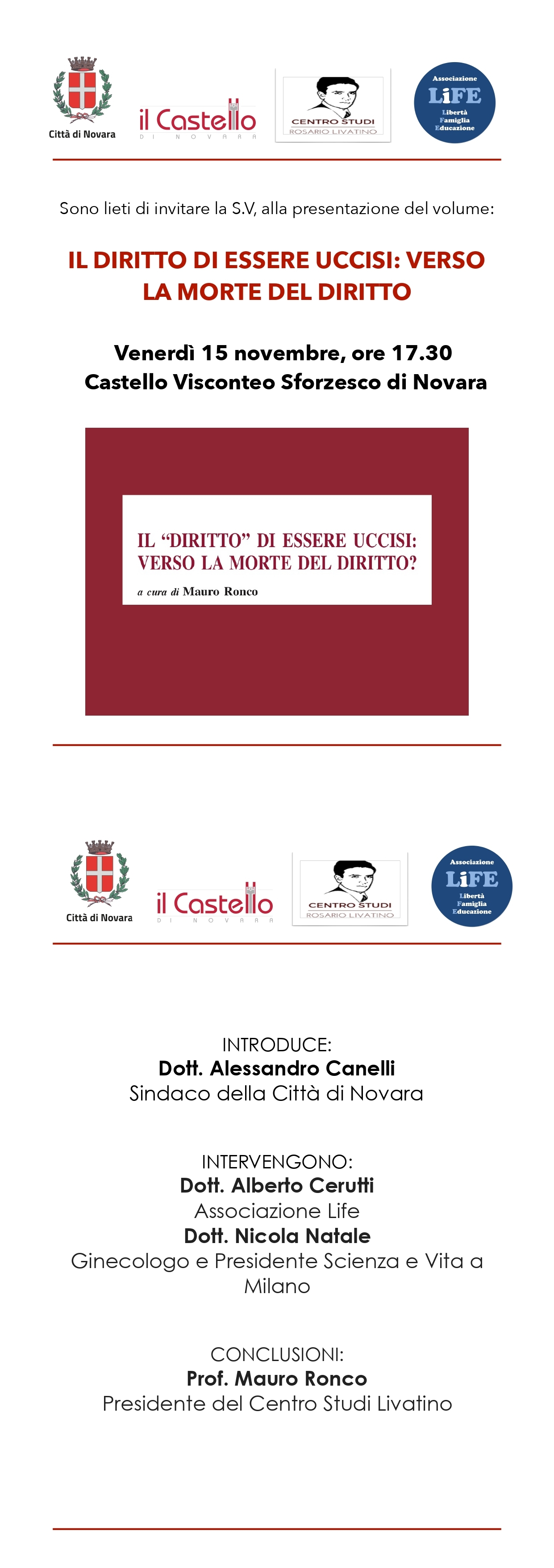 15 Novembre 2019, ore 17.30, Novara, Castello Visconteo Sforzesco, su iniziativa di Città di Novara, Il Castello di Novara, Centro Studi “Rosario Livatino”, Associazione LiFE (libertà Famiglia Educazione), presentazione del volume “IL DIRITTO DI ESSERE UCCISI: VERSO LA MORTE DEL DIRITTO”.