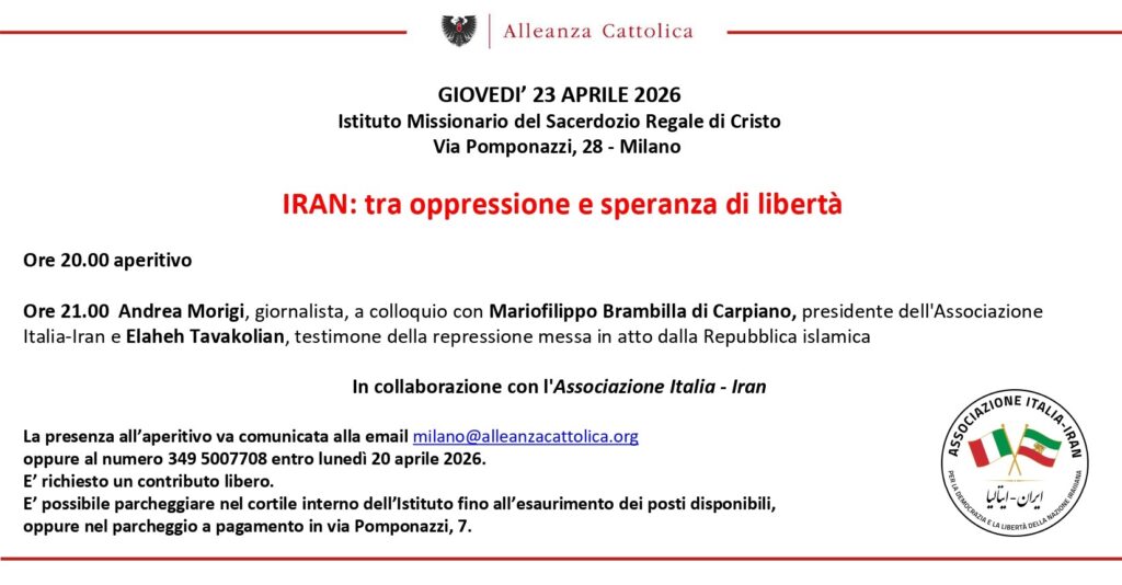 La presenza all’aperitivo va comunicata alla email milano@alleanzacattolica.org o al numero 349 5007708 entro lunedì 16 marzo 2026.