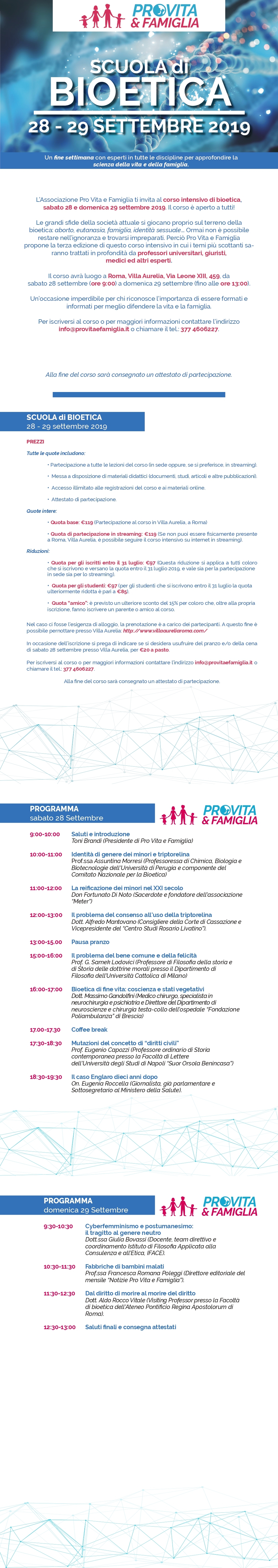 Sabato 28 e domenica 29 settembre 2019, ore 9, Roma, Villa Aurelia, Via Leone XIII, 459, corso intensivo di bioetica.