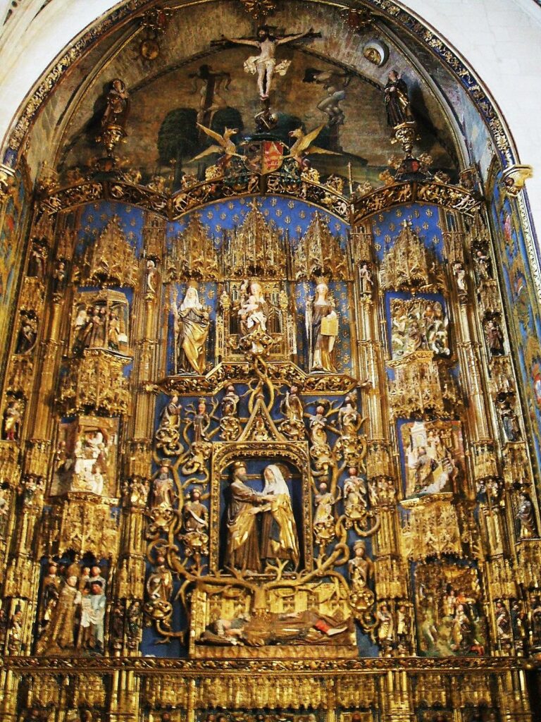 Ho sempre avuto una certa ritrosia per le ridondanze, ma il tabernacolo maggiore della Cappella di Santa Tecla è così traboccante di ori e di ricami che finisce per affascinarmi. Leggo sulla guida: è opera di Alberto Churriguera, è un «vero paradigma dello stile Churrigueresco»[1]. Non c’è pezzettino di materia che non sia stato lavorato e organizzato con amore pedante. Anche la luce fa fatica a muoversi su di esso; sull’oro che sembra armoniosamente liquefarsi, si adagia soltanto, non si esalta né si spegne, diventa luminosità dorata e tremula, come la fede autentica e cosciente. Prego, entrate pure: l’arcidiacono Fernando Diaz di Fuentepelayo, accomodato nel suo splendido sepolcro gotico, da tanti anni controlla l’ingresso alla cappella di Sant’Anna.