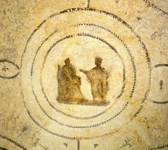 All’interno delle stesse catacombe, nella “Cappella greca”, così chiamata per le numerose iscrizioni in lingua greca, nella sommità del soffitto è rappresentata l’Annunciazione.