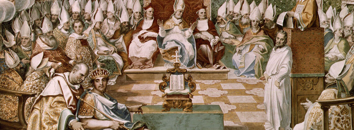In Occidente il concilio iconograficamente più rappresentato è quello di Trento (1545-1563): prima di allora non si era quasi mai pensato di rappresentare un’assemblea ecclesiale, forse per una maggiore considerazione della peccaminosità umana. Siamo vasi di coccio che trasportano l’oro di una dottrina purissima: si preferiscono la professione verbale e la concretizzazione degli enunciati di fede. Quando si raffigura un concilio, l’unica aureola è attorno alla colomba dello Spirito Santo.