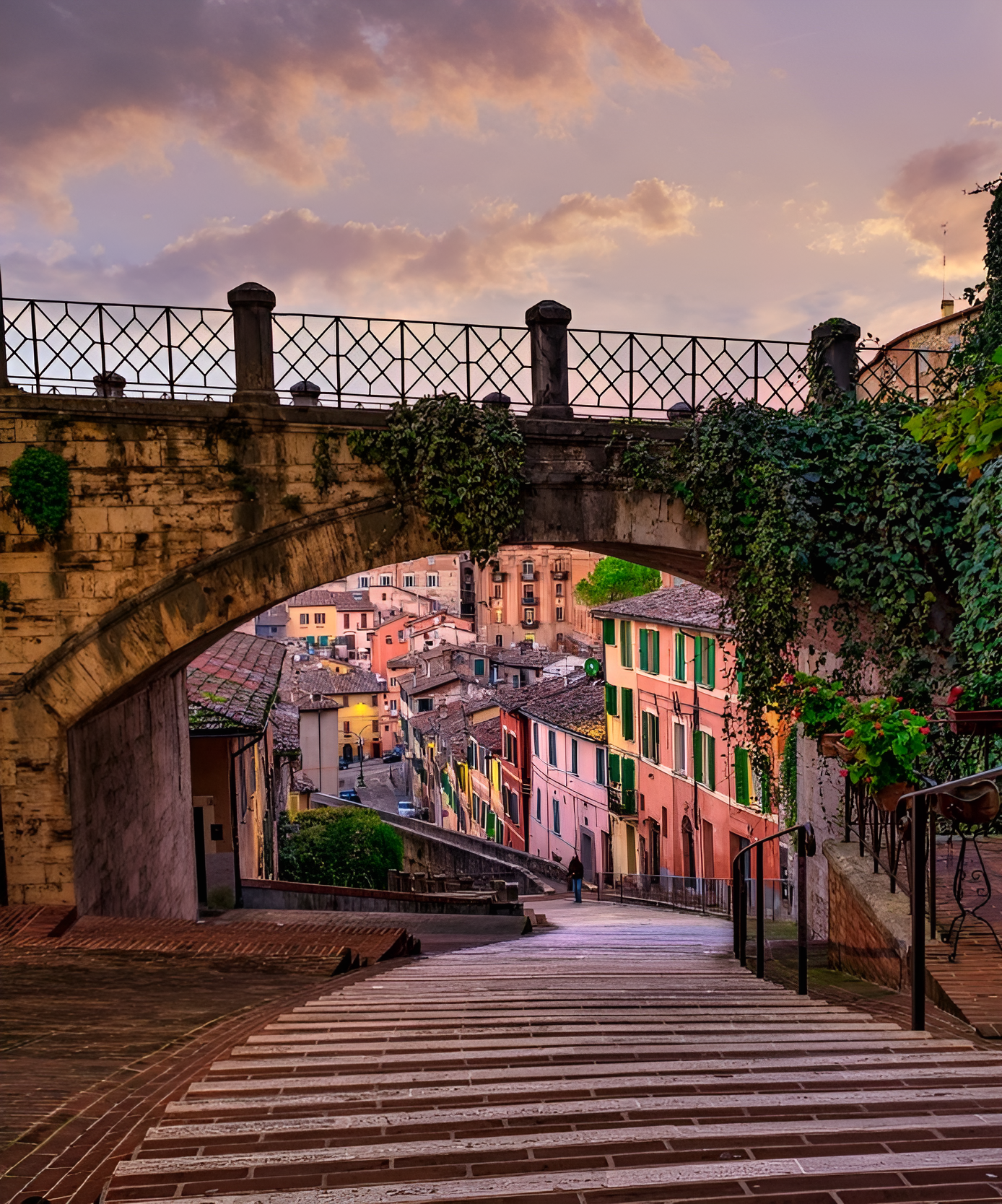 Perugia, cuore verde dโItalia, รจ una cittร che intreccia storia millenaria, arte sublime e profonda spiritualitร . Fondata dagli Etruschi, fu poi importante municipio romano e, nel Medioevo, libero Comune fiorente. Le sue mura antiche, le porte monumentali e i vicoli in pietra raccontano secoli di grandezza e tormento. Nel suo cielo si riflettono le ombre dei papi che vi trovarono rifugio e dei santi che la abitarono: san Costanzo, primo vescovo e martire, e san Lorenzo, venerato patrono. Lo splendore della Fontana Maggiore, scolpita da Nicola e Giovanni Pisano, incanta come poesia scolpita nella pietra. Perugia รจ anima e pietra, fede e bellezza, memoria viva nel cuore dโItalia.