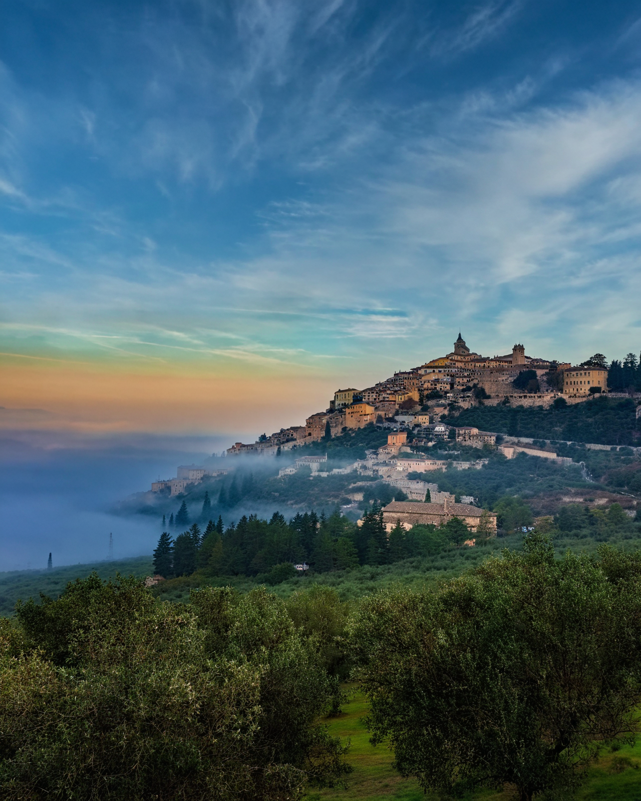 Trevi sโinnalza come un gioiello tra cielo e terra, distesa sul fianco del Monte Serano e circondata da uliveti secolari che lโhanno resa simbolo di pace e bellezza. Di origini romane, visse il suo splendore nel Medioevo come Comune fiero e devoto, custodendo chiese, palazzi e silenzi antichi. Cuore spirituale รจ la chiesa di SantโEmiliano, dedicata al santo patrono martire, che secondo la tradizione qui visse e fu sepolto. Vicina a luoghi benedettini come lโabbazia di Bovara, Trevi fu attraversata dallโinflusso di san Benedetto da Norcia e dei suoi monaci, ma anche da san Francesco dโAssisi, che amava questi luoghi di quiete e natura.